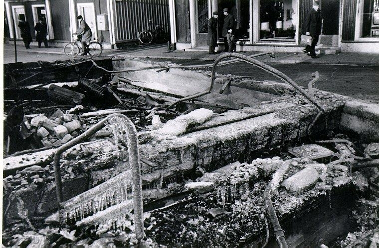 Kv. Källarmästaren, Storgatan 3, Veramagasinet, "Munkagården",efter branden i december 1963.