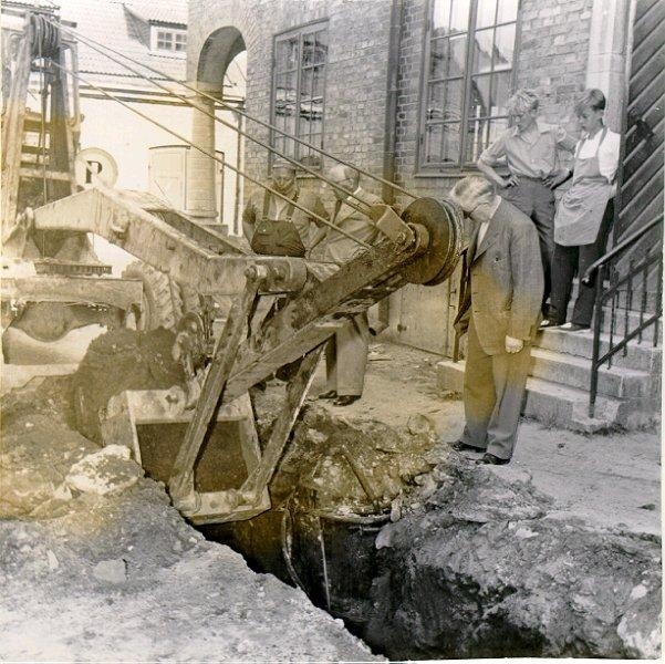 Falköpins Tidnings tomt. Fynd i jorden av en laggad trätunna. 1957. 2. Fynd i jorden av en ornerad kalksten. 1957.