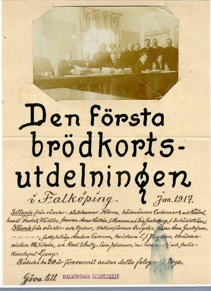 Den första brödkortsutdelningen i Falköping januari 1917. Sittande från vänster: Stadskamrer Ahrne, rådmannen Cedermark, och Håård, handl. Fredrik Westlin, Fruarna Anna Hultén, född Hansson, och Iris Gunterberg född Schöldström. Stående från vänster: Adv. Rydner, Stationförman Bergsten, Fröken Anna Gustavsson, fastighetsäg. Anders Larsson, snickare L.J. Jungblom, skräddaremästare M. Silwén, arb. Karl Strutz, Levin Johansson, poliskonstapel Ljung.