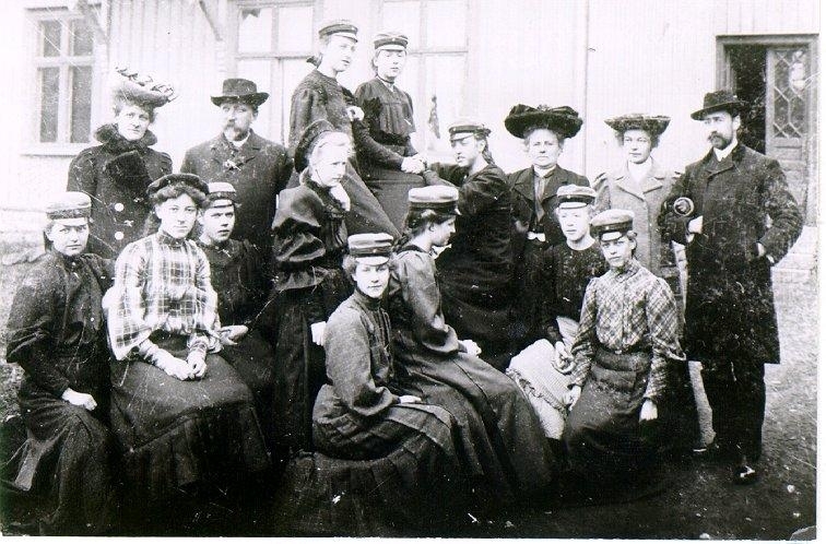 Folkskolan. En skolklass 1908. Fru Qvänsel, pastor Brodén, fröken Blag, mag. Malmström med fru.