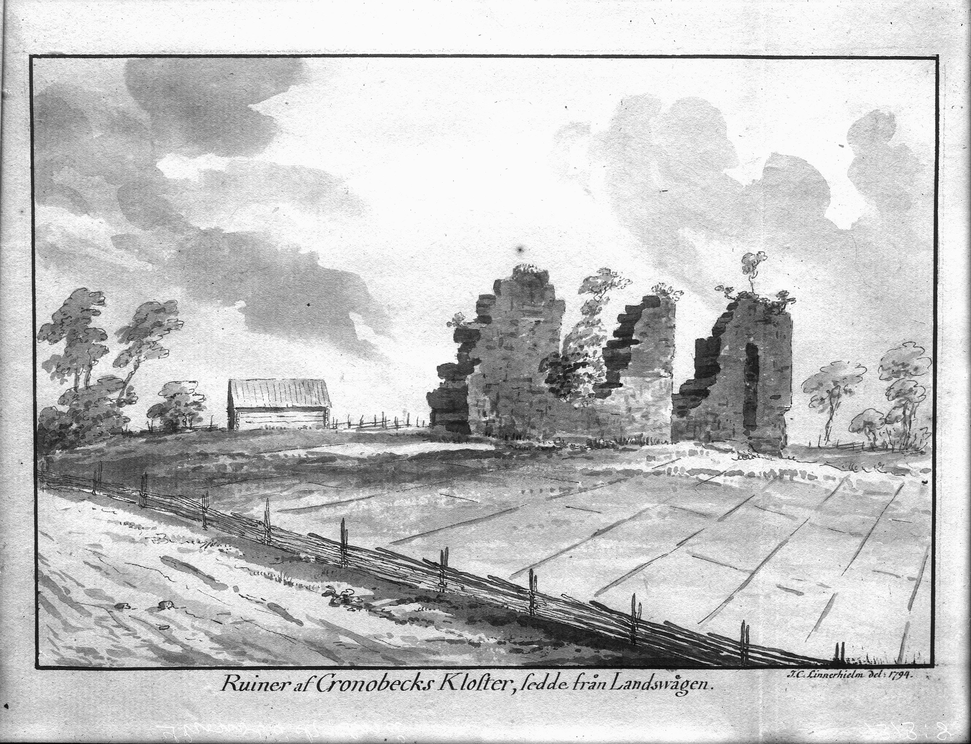 Beskrivning: Klosterruinen år 1794. Foto efter tuschlavering av Linnerhjelm.