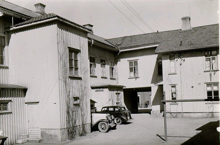 Gårdsparti till Veramagasinet. Portgången leder ut till Storgatan. Till vänster ingång till ölserveringen. Längre bort trappan till Ullbergs matservering.