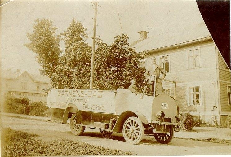 En Falköpings "Barnens Dags" - buss. Bussen parkerad utanför postkontoret Falköping 2. Chaufför Göthberg.