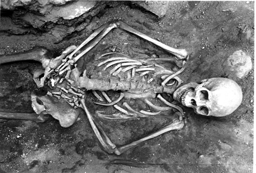 Gudhems klosterruin. Grav 21. Kapitelsalen. Foto mot V. Vid pilen enkel fingerring av mässing. D.410