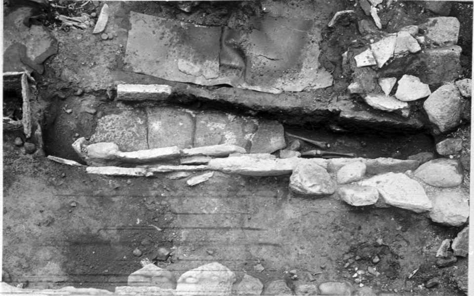 Gudhems kloster. Grav 20. Kapitelsalen. Graven tömd. Grav 12 till vänster. Foto mot n.