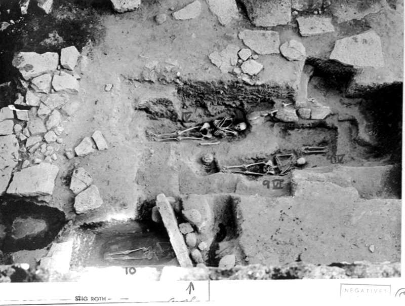 Gudhems kloster. (Långhuset) gravar 9 och 10 i mittskeppet. Till vänster Helga korsaltarets grund. Längst ner avslagen rest sten.
