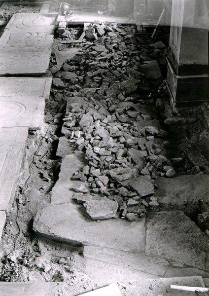 S:t Olofs kyrka. Restaureringen 1958-1961. Långhuset. Stenfyllning under norra och södra bänkkvarteret, sedd från orgelläktaren.