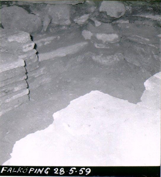 Titel: S:t Olofs kyrka. Restaureringen 1958-1961. Resterna av romanska spiraltrappan i torngrundens södra mur. Romanska torngrunden blottad. Fr. nordväst och fr. nordost.