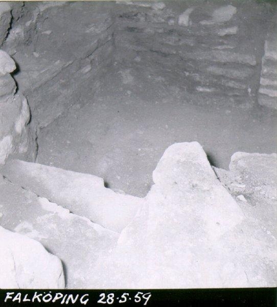 S:t Olofs kyrka. Restaureringen 1958-1961. Resterna av romanska spiraltrappan i torngrundens södra mur. Romanska torngrunden blottad. Fr. nordväst och fr. nordost.