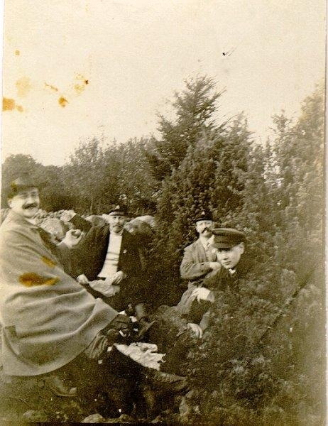 Från fältmanövern 1912. Falköpingsbor på rast i Hällestadskogen. Den tredje mannen från vänster Bruno Larsson /Spritbolaget/.