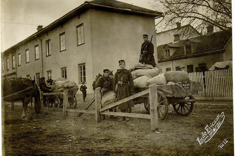 Från fältmanövern år 1912. Dotorpsgatan med gårdsinteriör av J. Janzons fastighet Storgatan 18. Högt bakom skymtar N.Ekmans & Co:s fastighet, Storgatan 20. Armémanöver pågår.