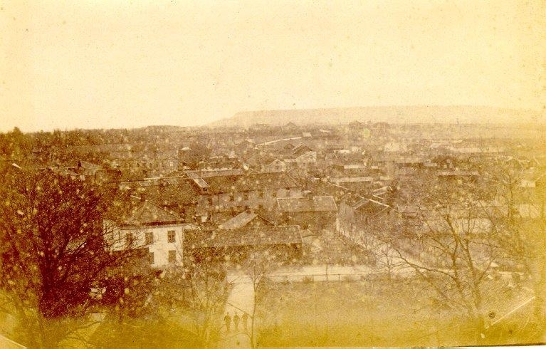 Vy från kyrktornet: Falköpings Tidnings komplex ligger nu på samma plats som huset längst ner till vänster med den öppna genomfarten/portvalvet. Nils Johnsons magasin fanns ej heller då.