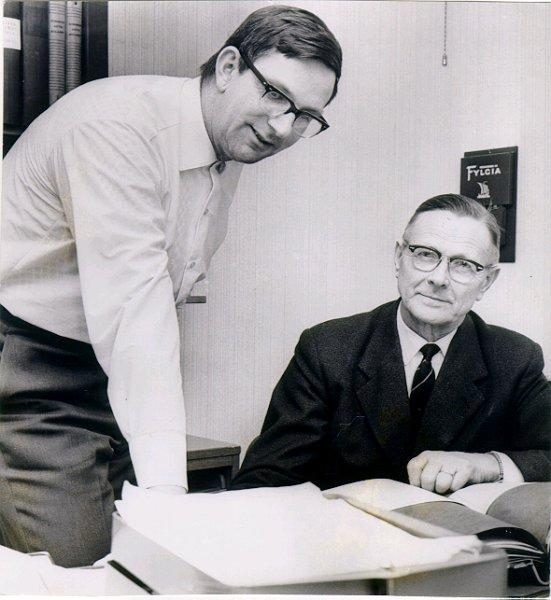Kommunalmän i Torbjörntorp. Sittande: Kommunalkamrer John Edström. Stående kommunalkamrer Helge Karlsson (förste kom.kamrer i Gudhems nya kommun).