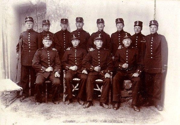 Foto antagligen från Korpralskolan i Axvall. Tredje man fr.v. sittande nr 569 Palm, 10 komp. I9 Axvall. Palm var 28 år vid regementet, vid värvningen fick han detta knektnamn, han var född Larsson.