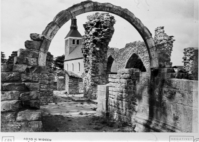 Kyrkan. Södra sidokoret. Foto mot nordväst. Båge uppsatt med de gamla på stället funna stenarna.