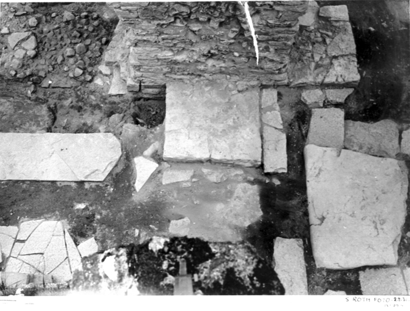 Södra sidoskeppet. Östligaste pelaren i dess arkad, sedd från söder, med rester i syd och väst efter sedermera bortrivna pelare.