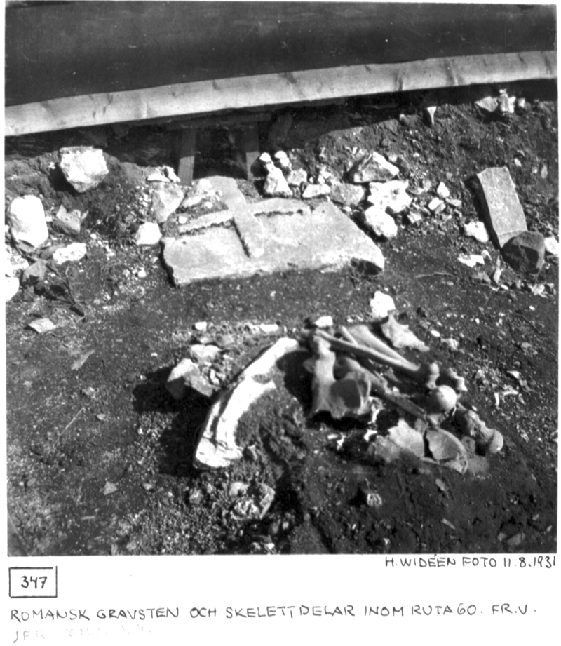 Romansk gravsten och skelettdelar inom ruta 60 från väster.