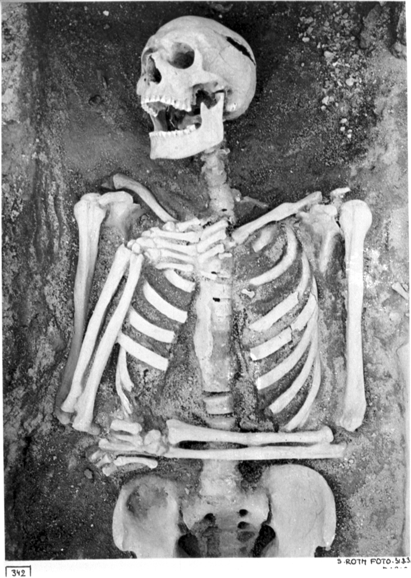 Grav 7. S. skelettet, detalj. Läkta frakturer på v nyckelben och v strålben. Huggblessyr på hjässan.