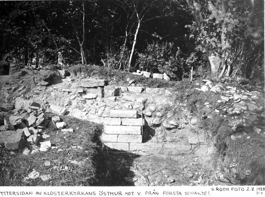 Yttersidan av klosterkyrkans östmur mot väster. Från första schaktet. Till v. vid pilarna överkanten av muren mellan södra och mittkoret.