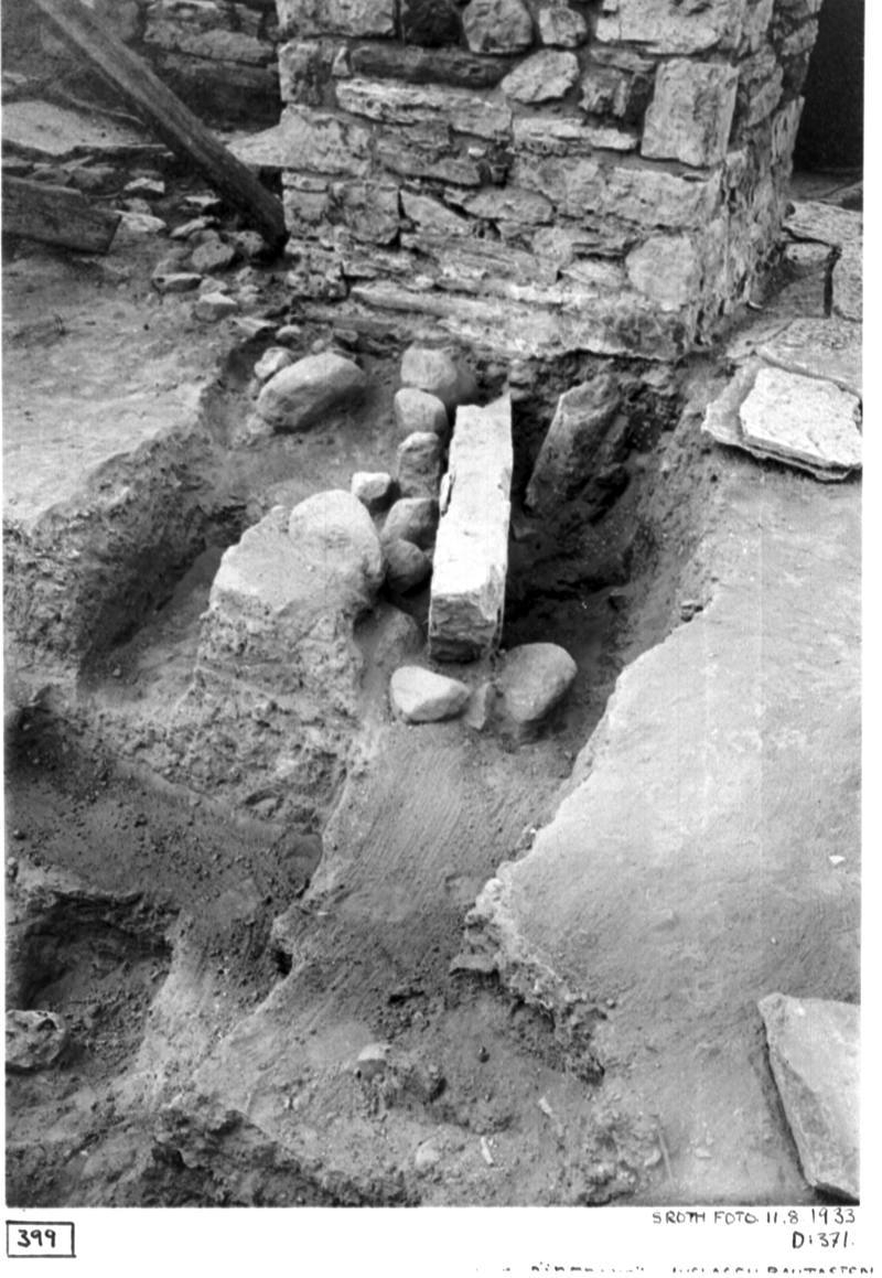 Mellersta pelaren i mittskeppets nordmur. Där framför avslagen sten från sydsydost.