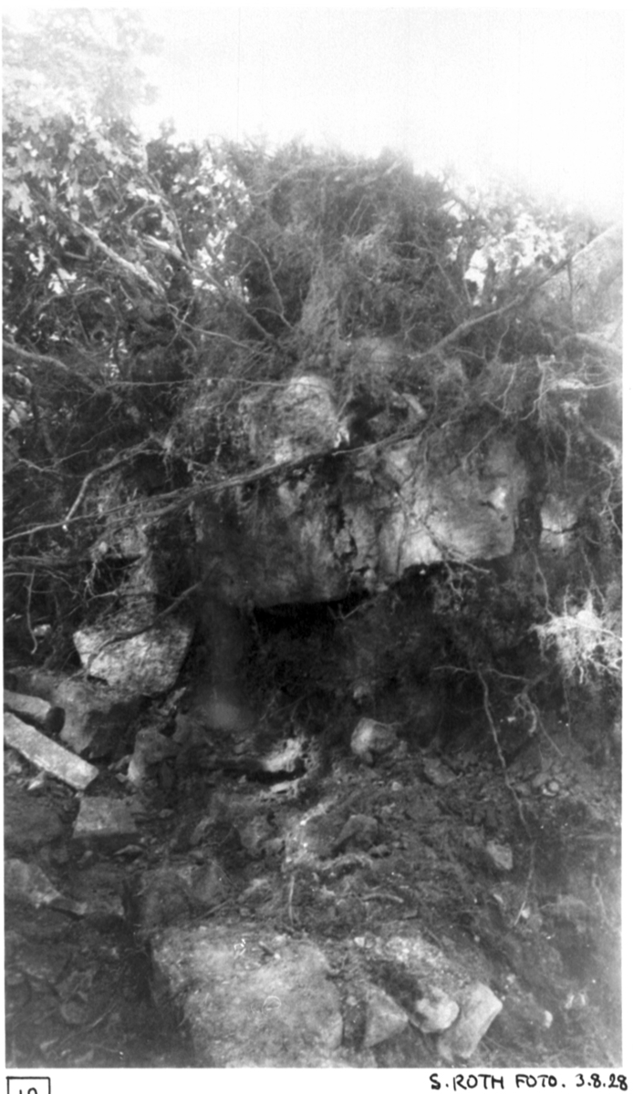 Fälld rönn å klosterkyrkans ö mur med tre stenkvadrar från murens v kant invuxna i roten.