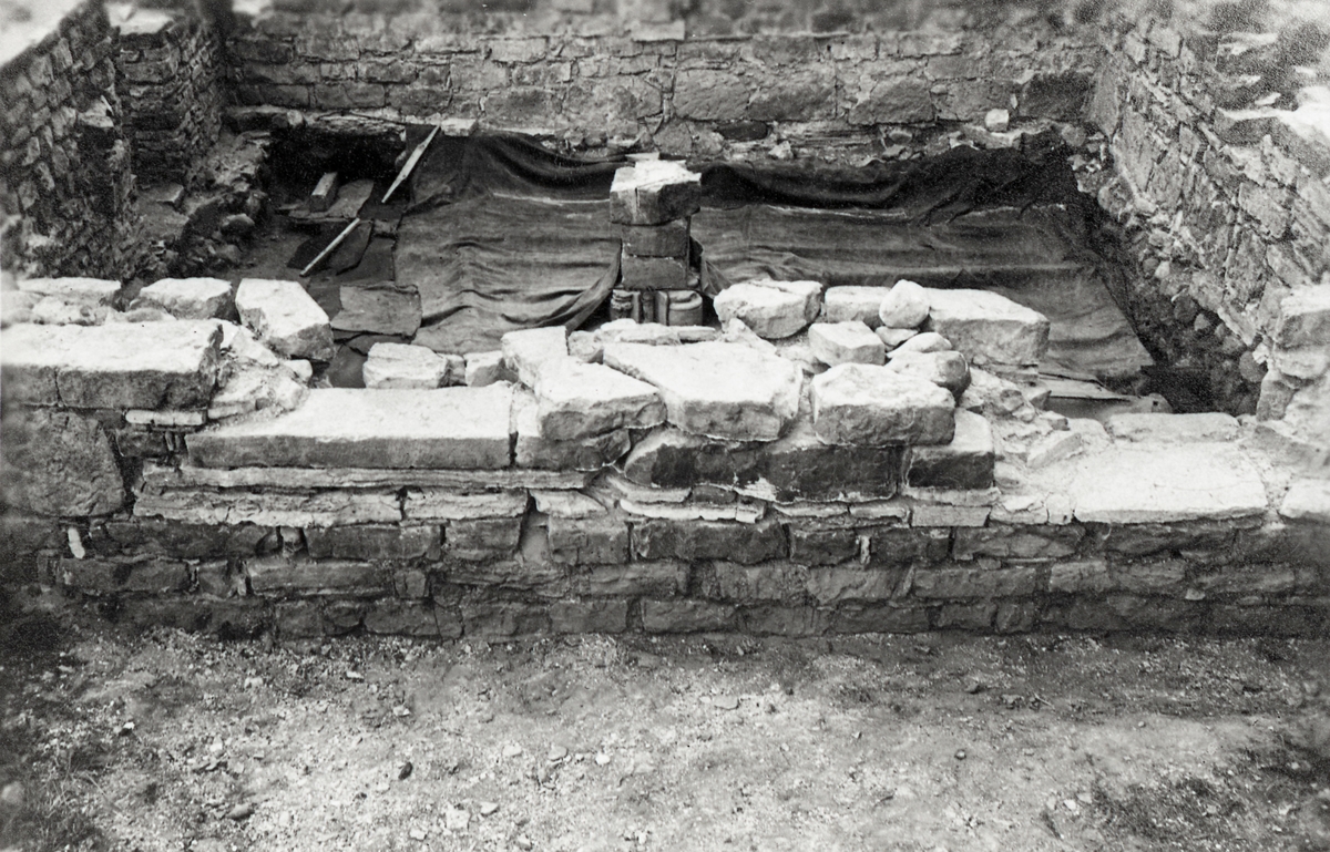 Kapitelsalens östmur sedd från ö. (utifrån) med två igenmurade fönsteröppningar.