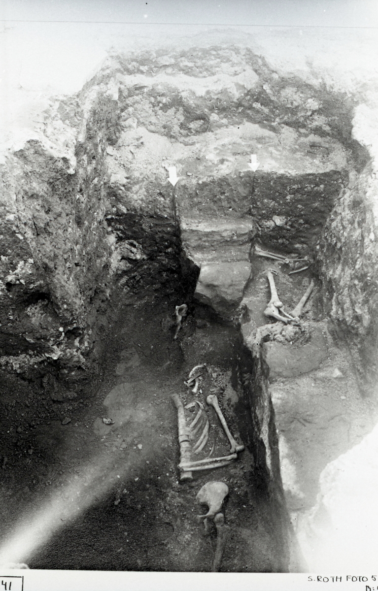 Grav 31. Mot v. Skelett I och VI under framgrävning. Mellan pilarna en ogenomgrävd jordvägg.