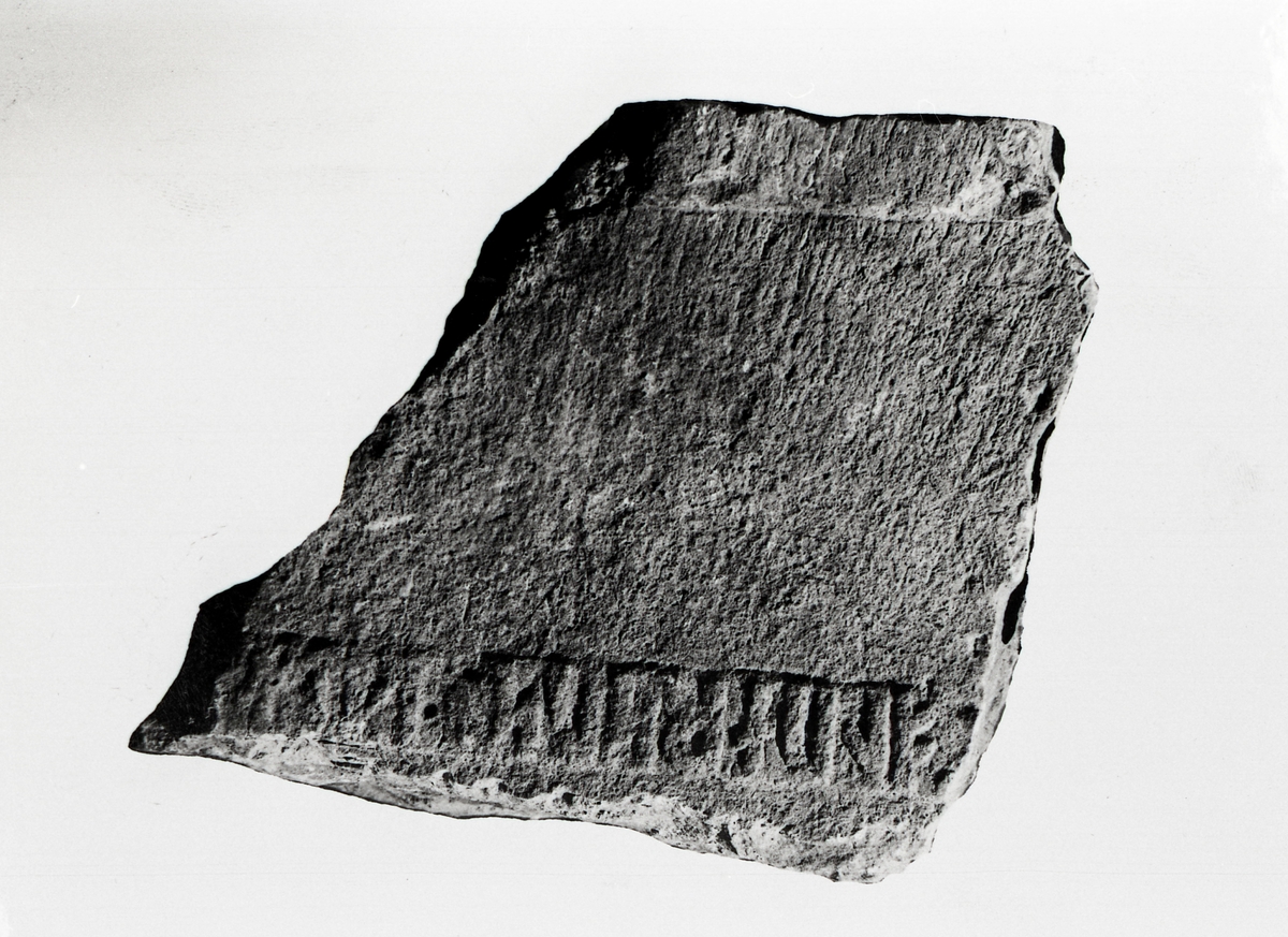 Gravstensfragment, sandsten. Funnen 1940 vid rivning av spismur å lägenheten Telackan. Om fragmentets grovlek 13,2-13,5, reliefens höjd 0,4 - 0,3.