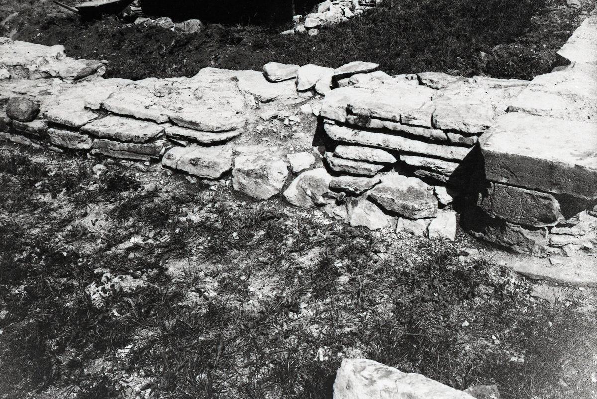 Västra korsgången. Södra delen av östmuren från sydväst snett uppifrån.