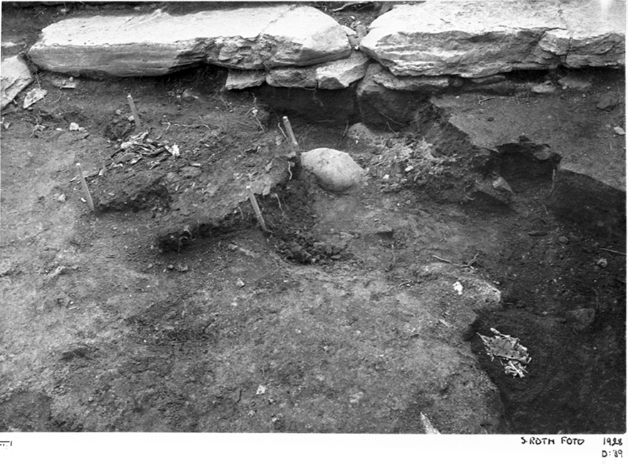 Nordöstra kapellet från väster. I fonden stenar vid östra muren, där framför trägolv II nederst till höger.