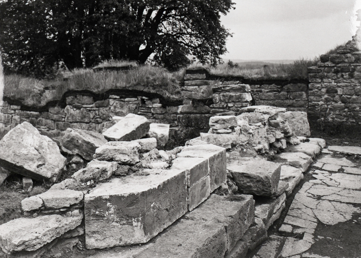 Södra korsgången. Nordmuren under konservering från sydväst.