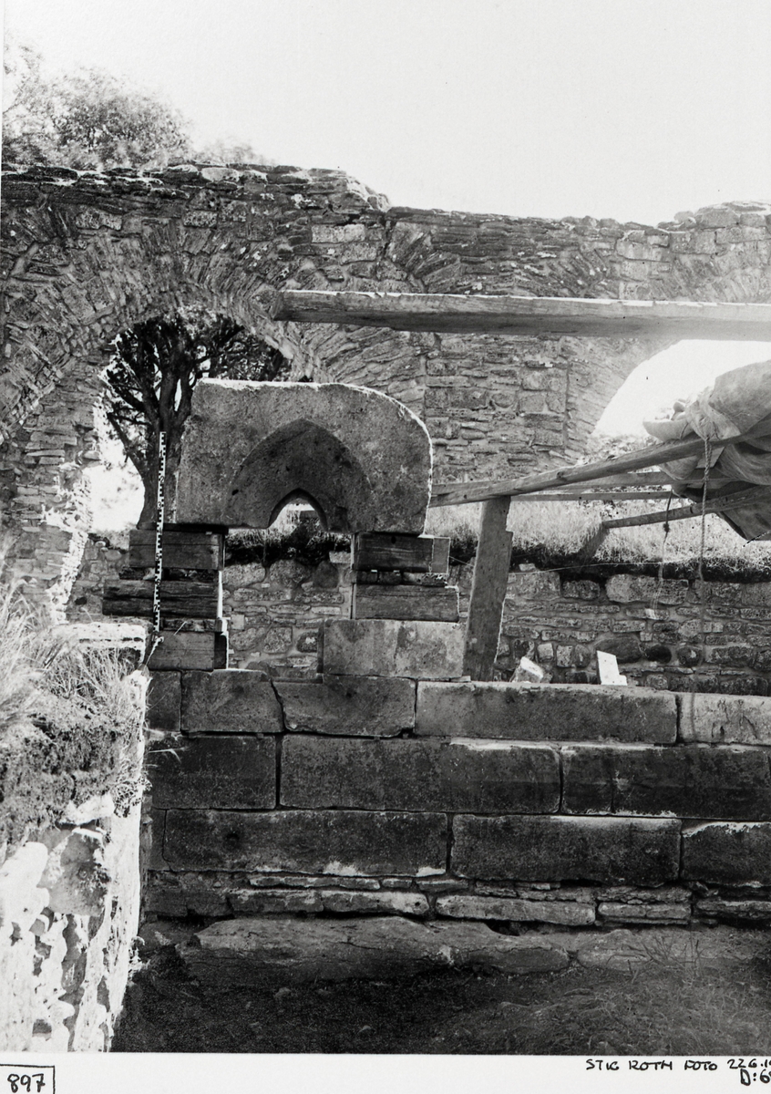 Södra korsgångens nordmur. Yttersidan nordöstfönstret. Provuppställning från norr.