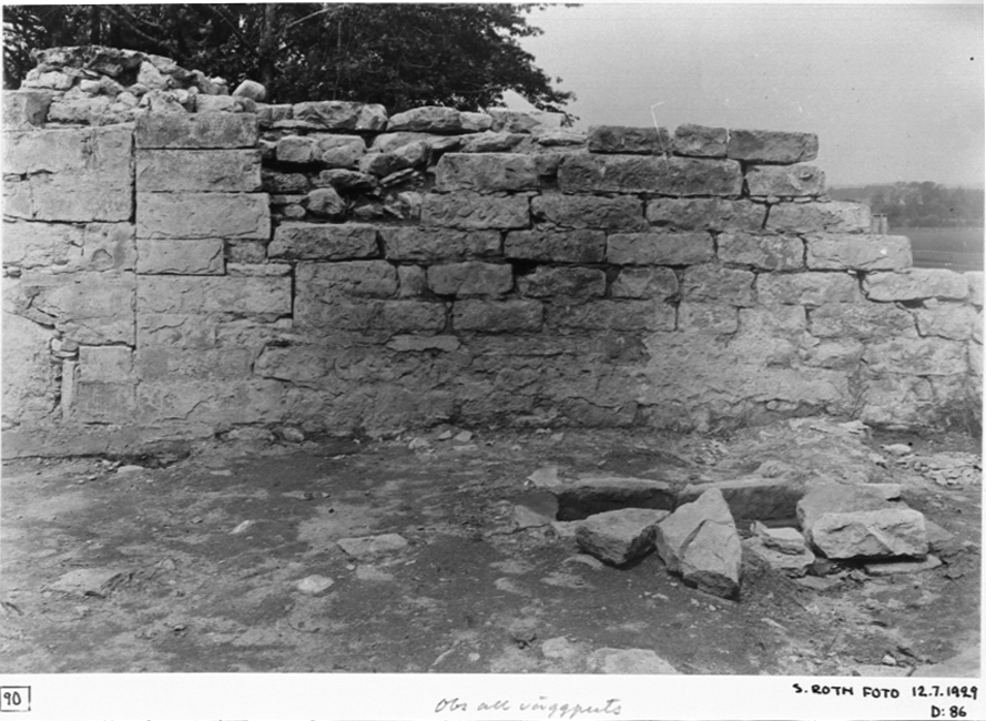 Mittkoret, ö. delen av n .muren från söder. Obs. all väggputs i förgrunden. Grav 1.