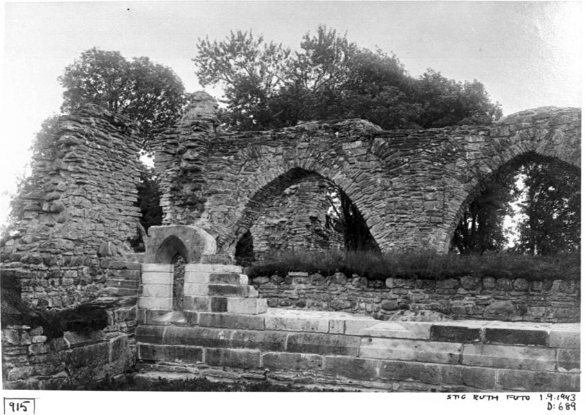 Södra korsgångens nordmur östra delen med det återupsatta fönstret från norr.