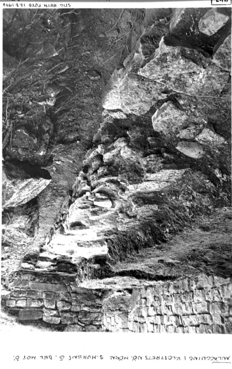 Anläggning i klostrets nordöst hörn. Sydmuren mot v. T.v. östlängans nordmur, t.h. nordlängans östmur.