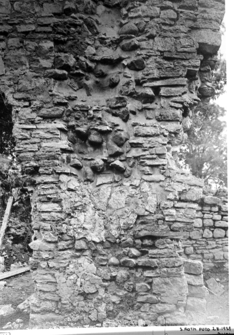 Östligaste pelaren i mittskeppets sydmur från norr. Före konserveringen.