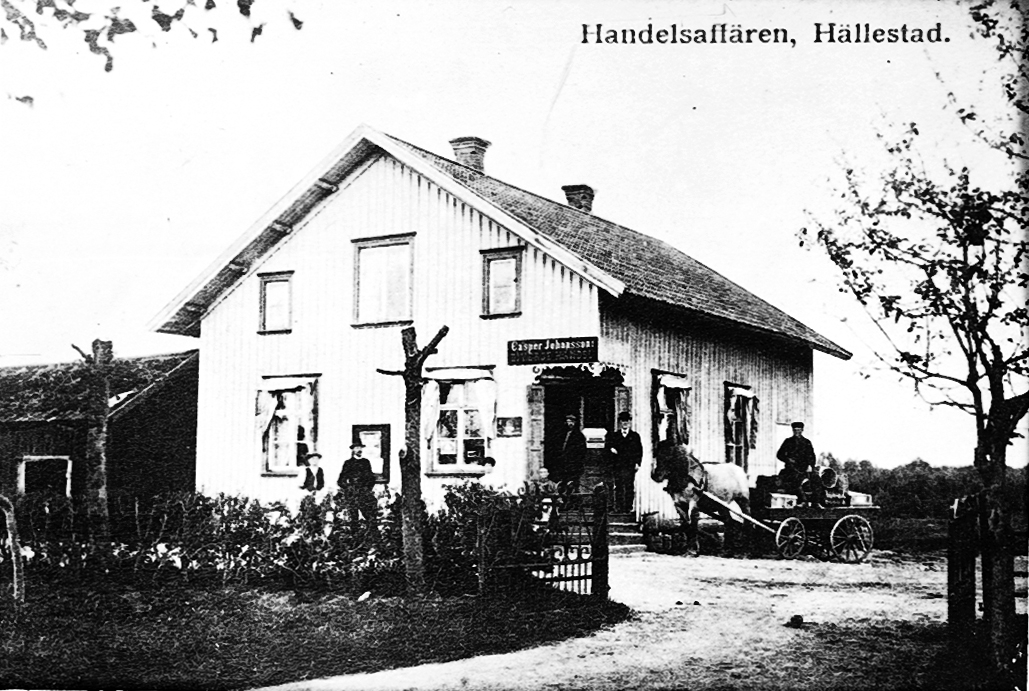Hällestads affär. I hatt på trappan till höger Casper Johansson.