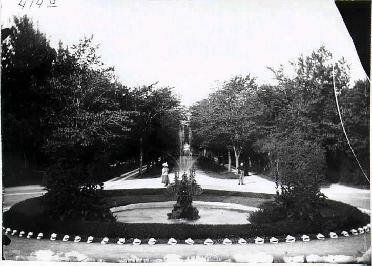 Socitetshuset. Allén från entrén fram till dammen med springvatten.