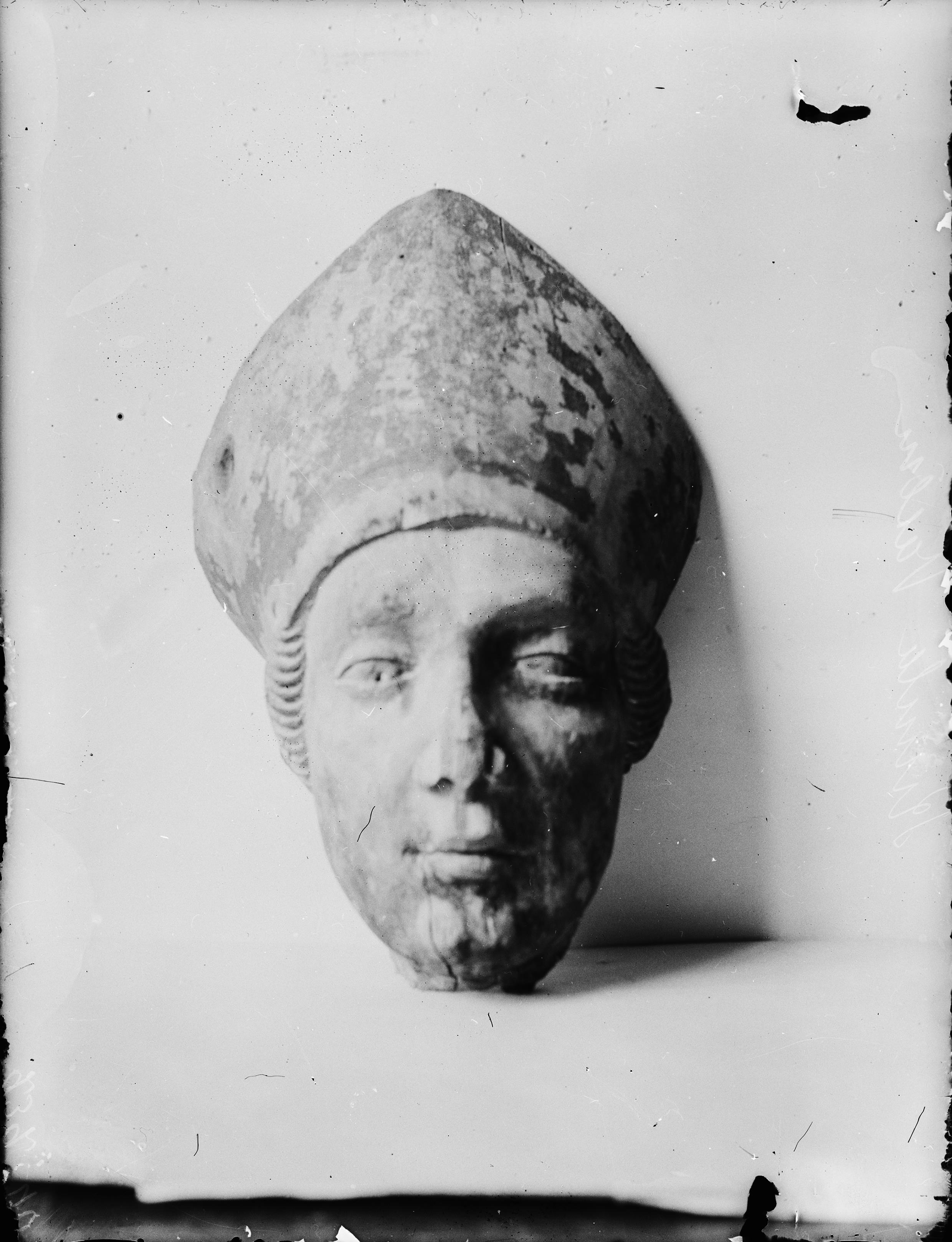 Beskrivning: Medeltida biskopshuvud. Mitran lågt över pannan. Huvudet har utförts i två halvor, nackpartiet saknas.