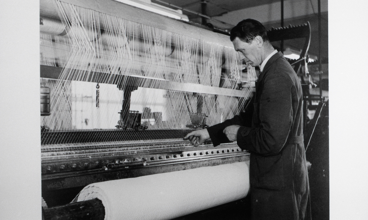 "Rascelmaskin" (Tillverkar mönstrad och genombruten trikåväv). Från utställningen "Falköping i bild" 1952.