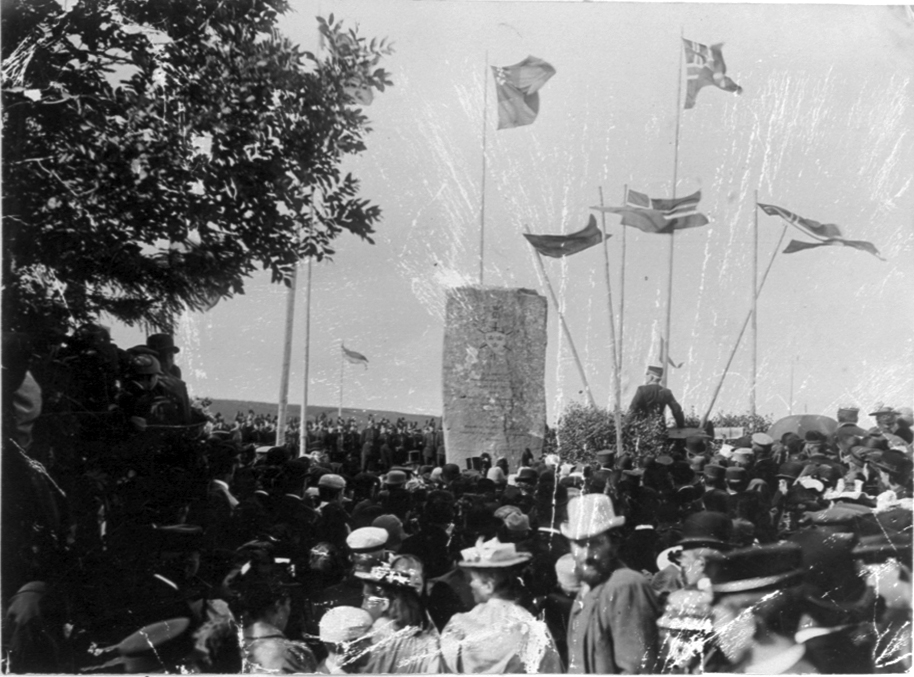 Invigningen av Åsle-monumentet. Inskrift: "Till minne af de skandinaviska folkens seger den 24 februari 1389 reste Vestergötlands Fornminnesförening och ortens befolkning denna sten 1896. Svenskar, Norrmän och Danskar minnens edra fäders gemensamma bragd!"