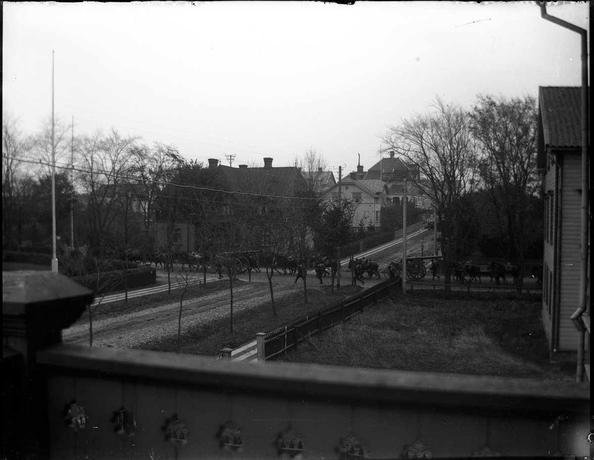John Liedholms glasplåtssamling. Utsikt från hemmet. Militär marsch?