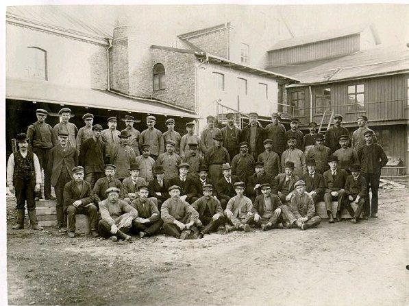 Arbetsstyrkan vid Haglunds 1912 eller 1913. Det är idel Falköpingsbor på bilden, alla anställda vid Haglunds. Bilden är tagen vid fabrikens baksida och den måste vara tagen efter 1911, eftersom det var detta år som den stora skorstenen byggdes. Namnen på personer i rad 2, på de utlagda lådorna sittande fr.höger.1 bokförare Harry Kronvall, 2 kassör Hilmer Widqvist, bosatt i Örebro sedan 1918. 3 representant Rudolf Melin, 4 representant Olle Haglund, 5 fabrikör Svante Haglund, 6 disponent Josef Haglund, 7 kontorist Arvid Jakobson, 8 kontorist Ragnar Karlsson, 9 kontorist Erik Lundin, 10 kontorist Mårten Haglund, 11 reparatör Carl ? Göthberg. Nummer fem från höger i andra raden är chefen själv, fabrikör Svante Haglund och i denna rad finns också hattprydda sönerna Sven, Josef och Mårten. Längst till höger i denna rad sitter kontoristen Kronvall. Mannen med mustach i bildens mitt kallades Ost-Olle.