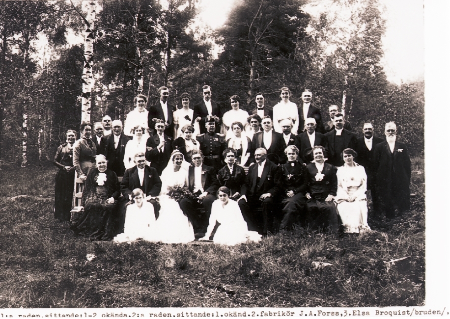 Karl Magnus Forss Bröllop 1916. 1:a raden sittande: 1-2 okända, 2:a raden sittande: 1. okänd, 2. fabrikör J.A. Forss, 3. Elsa Boquist /bruden/, 4. K.M. Forss /brudgum/, 5. fru Boquist /brudens moder/, 6. disponent Boquist /brudens fader/, 7-8. okända, 9. fru Rut Forss. 3:e raden stående: fru Augusta Hallenius, 2-3. okända, 4. folkskollärare Alfred Hallenius, 5-7. okända, 8. fru Rosa Kock, född Forss, 9. överstelöjtnant Allan Kock, 10-11 okända, 12. disponent P.A. Forss, 13-15. okända, 16. prosten Wetterholm, 17-18. okända. 4:e raden stående: 1-2. okända, 3. Gertrud Haglund, 4. disponent Titus Haglund, 5-8 okända.