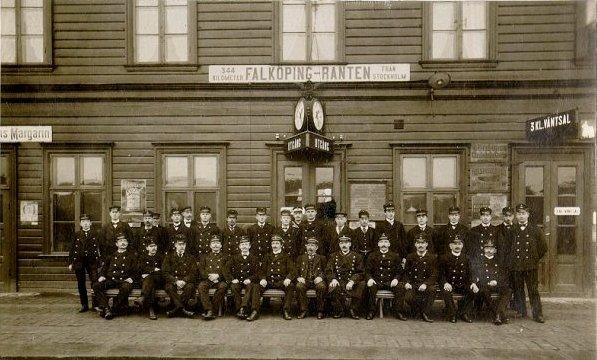 Järnvägen. Personal 1904. Falköping-Ranten. Stående fr.v.: 1. Gustav Jakobsson, 2. Axel Norén, 3. Fahlgren, 4. Nattvakt Andersson, 5. ? 6. Karlsson, 7. Aldén, 8. Holmkvist, 9-11. ?. 12. Käck, 13. Adamsson, 14, Georg Hultgren, 15. Åkerhage, 16-18.?. 19. Kvist, 20. Larsson, 21. Svensson, 22-23.?. 24. Eklöv, 25. Lund, 26. Ekstrand, 27. ?.28. Sahlgren, 29. Höglund, 30. Hedberg, 31-32. ?. 33. Lindblom. Namnuppgifter: Lokf. Allan Bergström, Eriksg. 27, Falköping. Nr. 3 sittande från höger är ev. C. A. Höglund.
