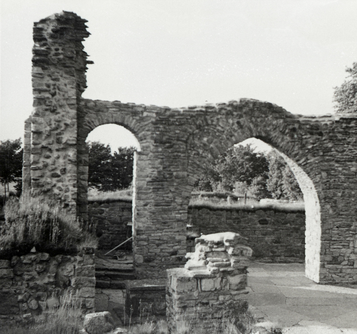 Klosterkyrkans v. del mot n- golvet ochmurarna konserverade. Lilla bågen rekonstruerad.