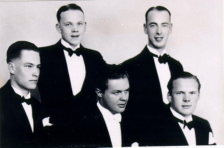 Dansband. Eugen Ranes ensemble på kuranstalten Mösseberg 1935. Från vänster: Stig Rybrant piano, Johannes Andersson sax, Gunnar Nilsson fiol, kapellmästare Sven Bernström fiol, Nils Holm cello.