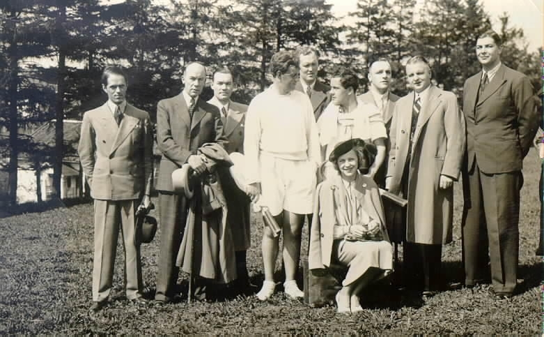 Invigning av tennisbanan 15/5 1938. Kalle Schröder har spelat tennis mot Nyström. Spelarna tillsammans med tennisföreningens styrelse. 1. James Forss, 2. Titus Haglund, 3. Gunnar Rane, 4. Kalle Schröder, 5. Arvid Båth, 6. Nyström, 7. Carl Magnus Asplund, 8. Hilding Vrang, 9. byggm. Hamrén, damen okänd.