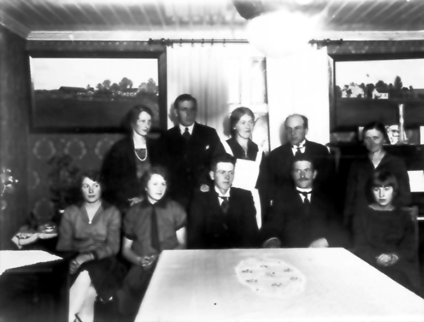 I finrummet hos Albert Johansson i Trädgården. Greta Erlandsson, Signe Erlandsson, Nils Erlandsson (alla från Haraslätt), Albert Johansson och dottern Gunhild. Bakom dem Anna Wallin gift Södergren, Gustav Södergren, Karin Johansson, Ellen Erlandsson. Bakom dem två gåramålningar av Ratikainen.