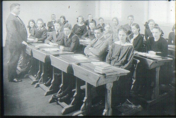 Klass Va, Falköpings Samskola, 3:3 våningen, nordöstra hörnsalen klassföreståndare: John Lindqvist, Adjunkt. Tillfällig åhörare: Rektor Bernt Drakenberg. Omkring 1920. 1:a raden från vänster: Svenborg Alexandersson, Dagmar Karlsson, Georg Seeberg (läkare i Lund), Sven Mörk (Stockholm), Samuel Goldstein, Elsa Persson. 2:a raden från vänster: Dagmar Wibelius, Falköping, Margit Wahberg, Allan Hagberg (son till rektor Hagberg), Lars Källén, Jenny Karlsson, Brita Sköld (Stockholm, gift med Einar Löth). Bakre raden: Bertil Smedberg, Harry Lundqvist, Stina Stadler (Göteborg, sjuksköterska). Allan Lind (Canada), Ingrid Lyberg, Greta Ögren (död i Stockholm).